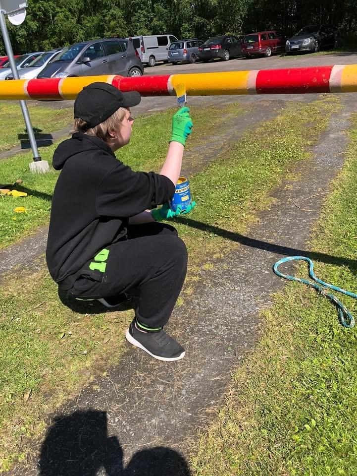 Päästiin taas mieluisaan hommaan eli maalaukseen. Siirtolapuutarhan parkkipaikkojen lähettyvillä olevat puomit piti maalata. Puomit piti ensimmäiseksi hioa puhtaaksi enimmistä tahroista ja roskista. Sen jälkeen puomit teipattiin, koska ne piti maalata kahdella eri värillä. Tämä oli aikaa vievää hommaa mutta oli kiva touhuta ulkona.